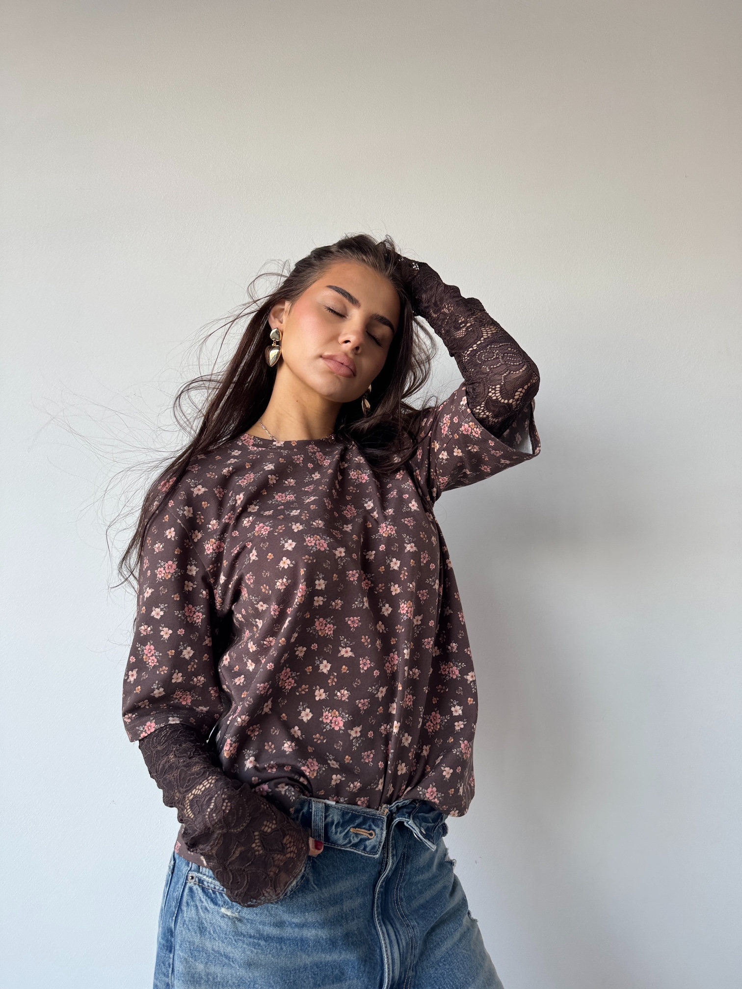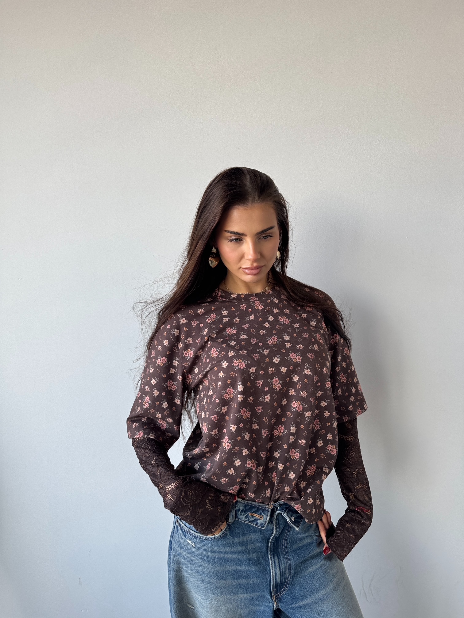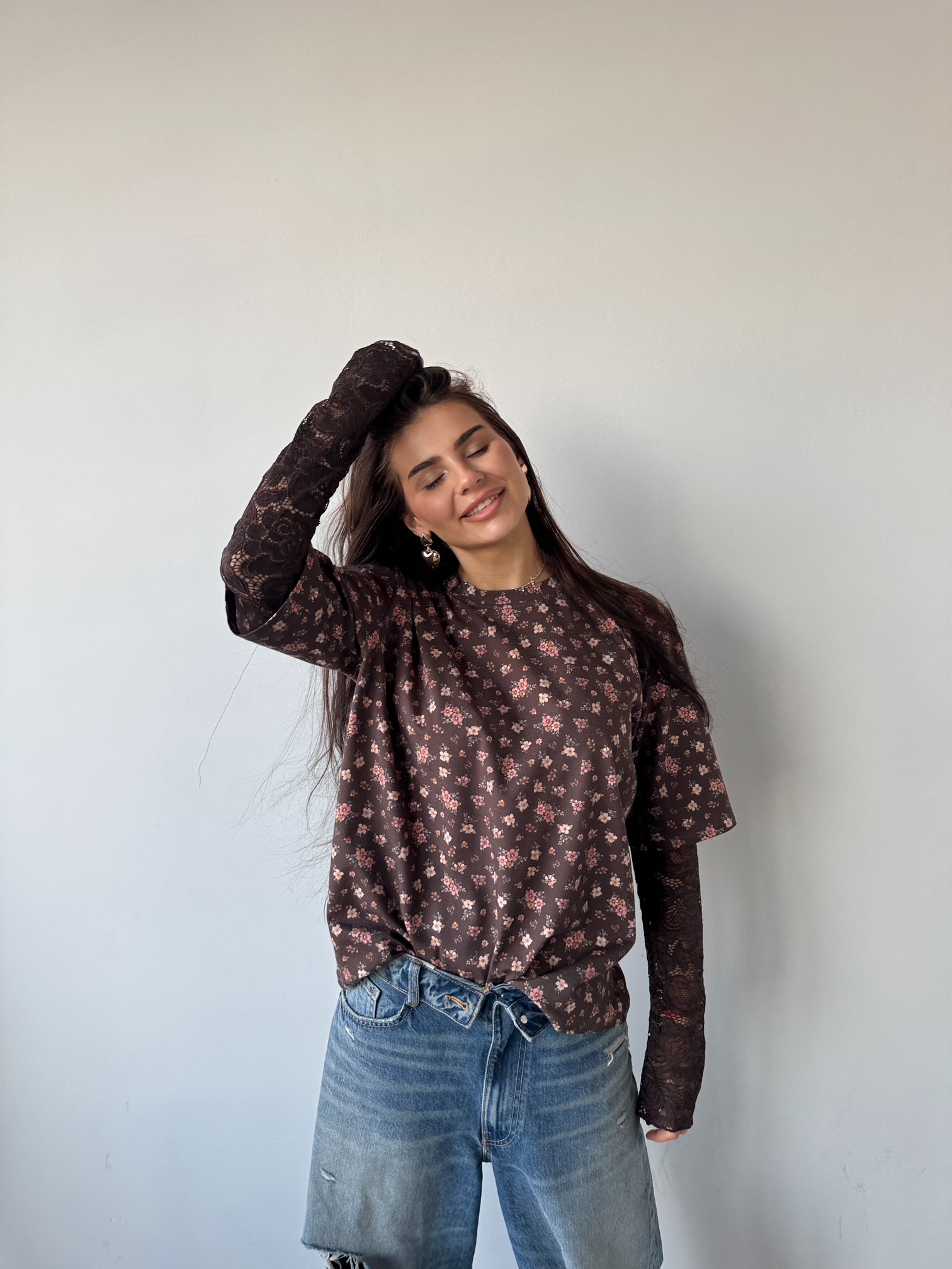 T-shirt bawełniany MILANO Brownie flowers z koronkowym rękawem