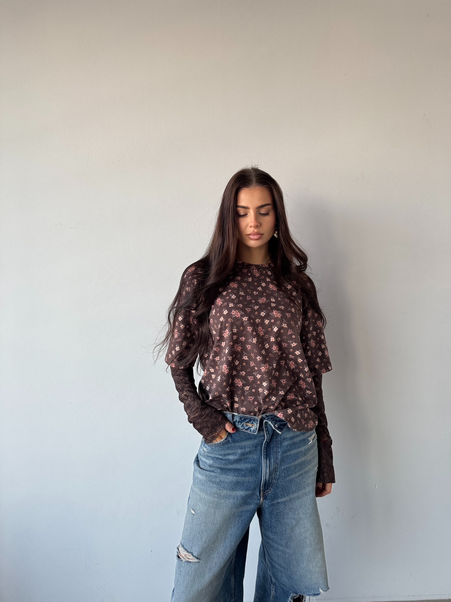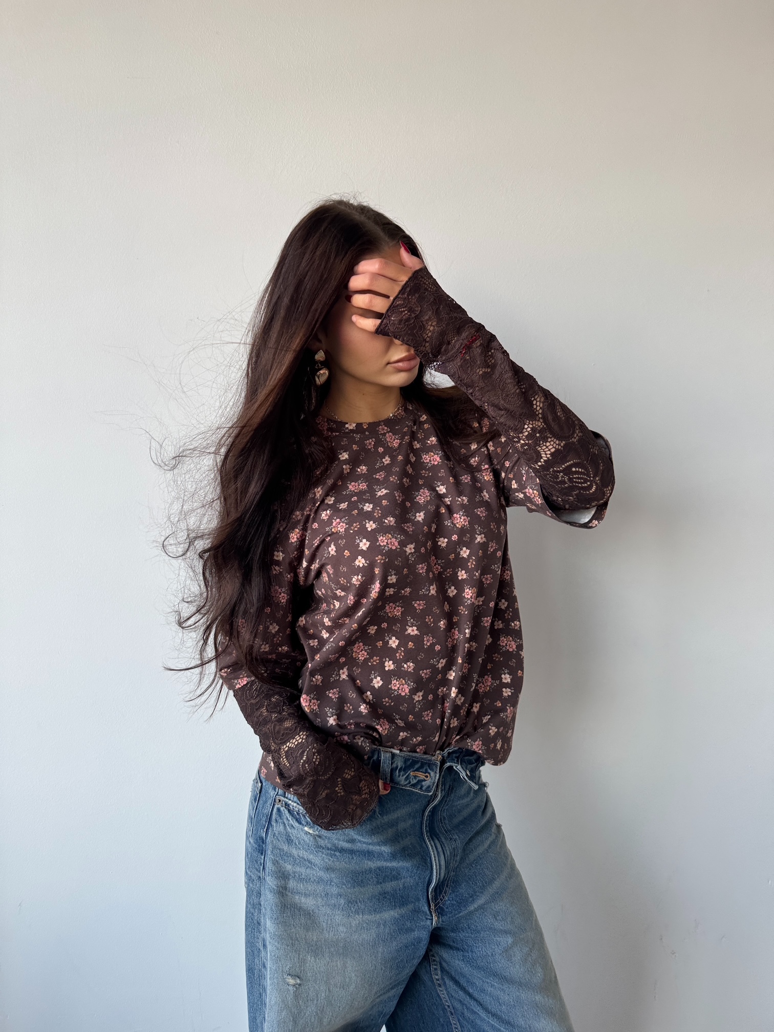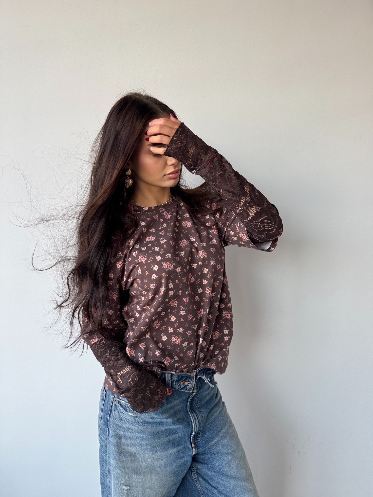T-shirt bawełniany MILANO Brownie flowers z koronkowym rękawem